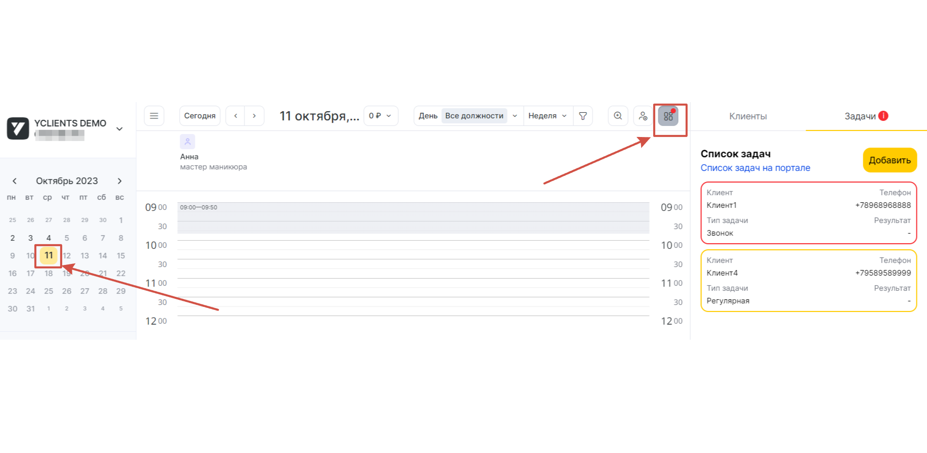 Данный модуль позволит вам создавать задачи внутри YCLIENTS. Все задачи будут отражаться у исполнителей в правой части Журнала записи. При переключении даты в Журнале - будут отображаться задачи на выбранную дату.